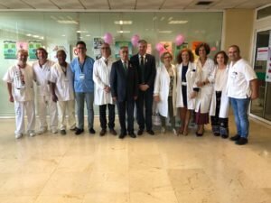 Con motivo del Día Mundial contra el Cáncer de Mama que se celebra mañana sábado, el delegado territorial de Salud y Familias, Juan de la Cruz Belmonte, ha visitado una de las mesas informativas instaladas en el Hospital Universitario de Torrecárdenas, junto al gerente del complejo hospitalario, Manuel Vida, y el director de la Asociación Española contra el Cáncer en Almería, Francisco Balcázar,.