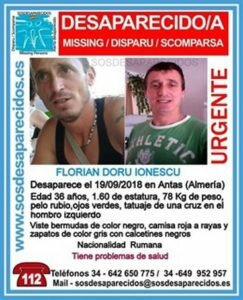 La Guardia Civil ha alertado sobre la desaparición desde el pasado día 18 de Florian D.I., un hombre de 36 años al que se le perdió la pista en Antas (Almería) y que, según el llamamiento, cuenta con problemas de salud, por lo que se ha solicitado colaboración para dar con él.