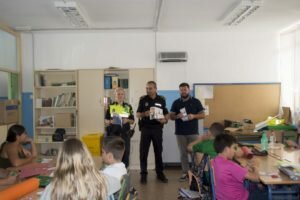 Durante la primera visita a los alumnos de 6º del CEIP Federico García Lorca, el jefe de la Policía Local , Jesús Ridao y la agente Eva Rueda Fernández, explicaron a los jóvenes las responsabilidades que conlleva ser propietario de una mascota y los beneficios que se derivan de la convivencia con animales. También aprovecharon la oportunidad para invitarles a que informen a sus padres de las responsabilidades y de algunos otros aspectos a tener en cuenta para ser buenos ciudadanos, como es el respetar el horario de tirar la basura a los contenedores y el respetar la señales de tráfico.