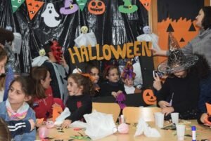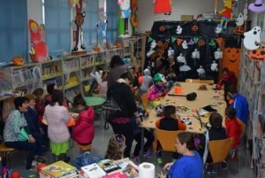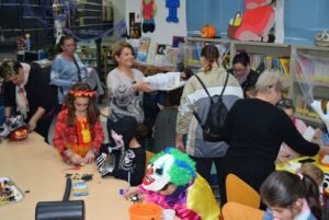 Desde primeras horas de la tarde en la Biblioteca Municipal “Adolfo Suárez, ha ido congregando a niños disfrazados de para la ocasión de brujas, demonios, vampiros, zombis, sepultureros, esqueletos, calabazas embrujadas, fantasmas, novias cadáver y un largo etcétera, que han participado con sus padres en un taller de manualidades, en el que ha confeccionado conjuntamente fantasmas, murciélagos, claveras, calabazas y otros motivo terroríficos, que luego han lucido durante la gran fiesta de la Noche de Halloween.