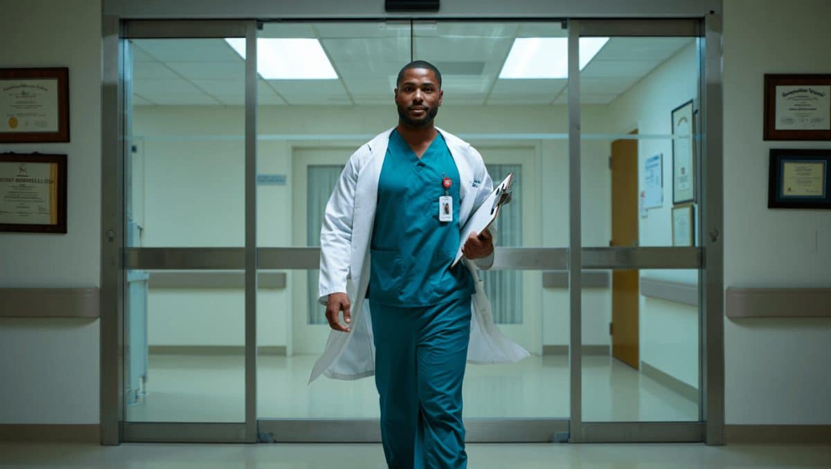La serie explica, sin hacerlo de forma literal, que Abbot combina su labor médica con actividades de alto riesgo. No es solo un médico de turno. En días libres acompaña a unidades tácticas.