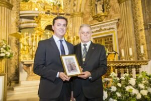 El hermano mayor, Elías García Amat, hizo entrega de uno de los carteles enmarcados al presidente como gesto de agradecimiento por el apoyo que recibe de la Institución Provincial.
