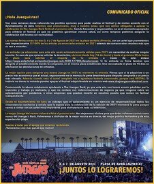 La empresa promotora ha anunciado que ‘The Juerga’s Rock Festival’ tendrá lugar durante los días 5, 6 y 7 de agosto del próximo año. Las entradas adquiridas para la presente edición serán válidas para 2021 sin necesidad de realizar ningún trámite. En cuanto a las devoluciones, podrán solicitarse desde el 16 hasta el 30 de junio de forma online si se obtuvieron por Internet (https://www.enterticket.es/eventos/juergas-rock-2020-127905/devoluciones) o bien en el establecimiento donde fueron compradas.