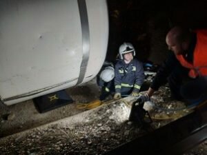 Después de horas trabajando para elevar la cisterna, a las cinco de la mañana de este jueves, se procedía a vaciar unos 10.000 litros a otra cisterna para, finalmente, poder levantarla sobre sus ruedas y proceder a su evacuación de la zona con total seguridad, sin derrame alguno y sin fugas.