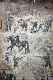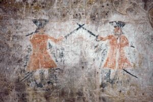 Entre los encarcelados que redimieron sus culpas en algún momento del XVIII se halló uno dotado de especial habilidad y sensibilidad artística, un presunto bandido que quiso amortiguar el tedio del encierro vertiendo quizá sus propias experiencias vitales sobre aquel pétreo lienzo. Porque en esa pared, a izquierda y derecha de la entrada al antiguo calabozo, plasmó de manera pródiga aquellas escenas de una vida que su memoria, ahora pausada, le brindaba con nitidez. Y demostró su dominio de la plasticidad en el momento de dibujar y pintar, su capacidad para recordar y retener detalles que luego trasladó a las figuras allí representadas. Colores blancos, negros y ocres otorgan forma y conceden dinamismo a los personajes –su creador es con mucha probabilidad el protagonista– que intervienen en asaltos a carruajes y carrozas, en duelos a pistola, en lances de espada, en apuñalamientos, en cabalgadas con arcabuz o mosquete apuntado, en tiroteos huyendo de la justicia. Sorprenden otras secuencias, en esta primitiva película, más amables y serenas donde asistimos al cortejo de un galante caballero a su dama, donde el recuerdo del reo se ve invadido por felices episodios de divertimento. A través de las situaciones retratadas, de los personajes involucrados, nos acerca a las indumentarias de mediados de la centuria ilustrada (casacas, calzones, jubones, chupas, vestidos femeninos, gorros, mantillas, calzados, etc.), a comportamientos ante la existencia o a su relación con las creencias religiosas, pues no falta la simbología católica: cruces, nazarenos, un trono procesional que representa el Monte Calvario…
