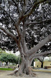En la distancia los árboles de Oliveros dialogan con el Cable Ingles y la cercanía de palmeras y árboles de la zona del puerto; con sus primas, hierbas gigantes, las palmeras de la Rambla, y con los hermanos proletarios del Paseo, todos sometidos cada año a la tortura de la poda versallesca. Pero allí mantiene un gran liderazgo el gran Ficus, un espléndido monumento del patrimonio almeriense. Que superó en su momento algún que otro intento para se derribo, ante quejas vecinales que no admiten que ningún árbol proyecte su sombra sobre las ventanas. De ahí, que no se permita el crecimiento libre de los árboles.