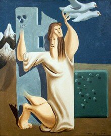 Una selección de piezas entre las que podemos suponer que se encontraba, a la vista de la firma del cuadro, Guerra y paz. Una onírica imagen en la que, a través de la extraña figura femenina bifronte que, arrodillada en el suelo, ocupa el centro de la composición, expresa el artista dos ideas contrapuestas. Así, sí la expresiva faz que mira hacia el lado izquierdo del cuadro, según la posición del espectador, se presenta triste y apesadumbrada ante la visión de una fantasmagórica construcción en la que los vestigios del conflicto bélico han quedado plasmados sobre su fachada en forma de simbólico rostro cadavérico cuya boca, de aciaga expresión, parece devorar la mano derecha de la mujer, en contraposición, la cara que se dirige hacia la derecha de la composición se presenta alegre y complacida ante la visión de dos blancas palomas, símbolos de la paz, que vuelan en un cielo azul limpio, alejándose de temores pasados.