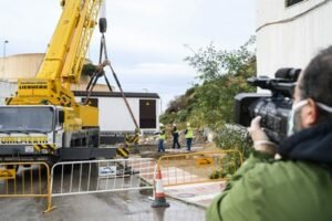 Tras esta actuación, la voluminosa grúa se ha desplazado a la plaza del Anzuelo, donde se ha instalado una segunda caseta de hormigón de las mismas características, que alberga también cuadros de Baja Tensión, celdas de Media Tensión, y dos transformadores de 1.000 KVA cada uno.