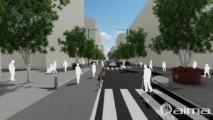 Además de lo anterior, la zona ampliada de calzada se distinguirá por la aplicación de un asfalto pulido, ofreciendo un color diferenciador de la calzada para vehículos y la instalación de jardineras en acero corten a lo largo del vial delimitando la zona peatonal del tráfico rodado con una interdistancia de seis metros. Alternado esa alineación se incluirá, como elemento delimitador también de este espacio, la colocación de pilonas tipo led solar. Completará la actuación la necesaria señalización horizontal y vertical.