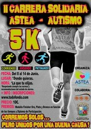 La inscripción, de 10 euros destinada a la Asociación Astea-Autismo, puede realizarse a través del enlace https://shop.believe-app.com/producto/ii-carrera-solidaria-astea-autismo/. Para participar, hay que descargarse la aplicación Believe en un dispositivo Apple o Android y en el apartado “Carreras” aparece este evento de cinco kilómetros que se desarrollará del 7 al 14 de junio. Durante esas fechas los participantes pueden elegir cuando y donde realizarla. La carrera se realizará seleccionando en la App la actividad de Running para quienes opten por correr o andar y la de Ciclismo, quienes la realicen en patines y se podrá elegir la mejor marca conseguida mientras dure la carrera.