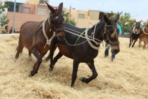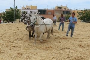 A lo largo de la mañana de este domingo se han realizado distintas exhibiciones del arte de la trilla a cargo de expertos que han desarrollado algunas de las tareas que con yuntas, mulos, yeguas y caballos se realizaban antaño para separar el grano del trigo.