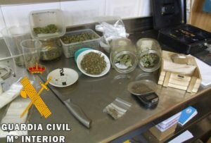 La Guardia Civil una vez recabada esta información procede a realizar el registro del inmueble situado en una galería comercial del Municipio de Roquetas de Mar (Almería), observando en su interior a dos personas intentando ocultarse, alegando que se encuentran en el lugar en ausencia de los responsables, estando una de ellas acompañada de un perro catalogado de raza peligrosa, asimismo se aprehenden 1.600 gramos de cogollos y picado de marihuana, balanzas de precisión,680 euros en metálico, equipos informáticos, armas blancas, 360 gramos de hachís, además de pequeñas cantidades de heroína, cocaína, cristal, éxtasis, setas alucinógenas, LSD y GHB.