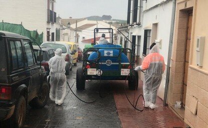 Los servicios de limpieza, fumigación y desinfección de calles y mobiliario urbano de los consistorios también han contado con la ayuda del voluntariado para estas tareas en las que han participado balizando elementos para evitar su uso o desinfectando.