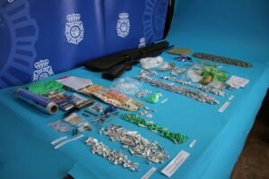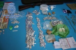 Durante el registro practicado por la Policía Nacional en el interior del punto de venta de droga, han sido intervenidas dos carabinas de aire comprimido, 8 rayas de heroína, 7 rayas de cocaína, 480 euros en billetes, 40 monedas de uno y dos euros, una balanza de precisión, 9 cuchillas de corte, 92 papelinas cocaína, y 146 papelinas de heroína.
