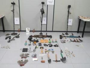Entre el material intervenido figura, además de las piezas extraidas, tres detectores de metales, barras de posicionamiento de detectores, equipos de radio, linternas frontales de luz, material para limpieza de las piezas extraidas como cepillos o equipamiento técnico. Además, en el vehículo utilizado por los investigados se encontró más instrumental relacionado con esta actividad ilícita.