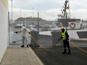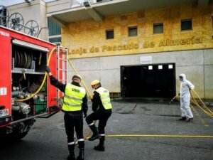 La UME ha desinfectado a fondo la Lonja del Pescado, tanto en su interior como en los alrededores, así como el edificio de la antigua Lonja, la Estación Marítima –la planta baja y el exterior-, el cobertizo de pasajeros y autobuses, la zona de registro de entrada y salida de vehículos, y las garitas de la Policía Nacional y la Guardia Civil