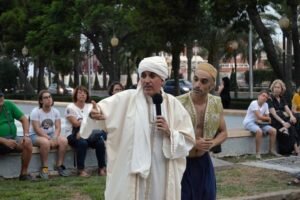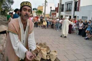 Las visitas en julio y agosto se trasladan al horario vespertino, concretamente a las 20 horas, protegidas del calor, y en el caso de la tarde-noche de ayer para conocer de la mano de Abd al-Aziz Al-Arbulí, científico andalusí del siglo XV, y Abu Al-Hasan, cocinero de la Corte del Rey Al Mutasim, el pasado gastronómico de la ciudad. Ha sido un paseo donde se han encontrado a un mercader, que ha explicado los sabores de las especies, e incluso a Claudio Salis, un trabajador romano de las antiguas balsas de salazón, que se retrae tiempo atrás para hablar de la influencia gastronómica de su civilización.