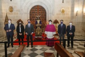 El presidente de la Diputación de Almería, Javier A. García, acompañado por los diputados provinciales Fernando Giménez y Manuel Guzmán, ha participado en la veneración al Cristo de Medinaceli que ha tenido lugar este viernes en la Catedral de Almería.